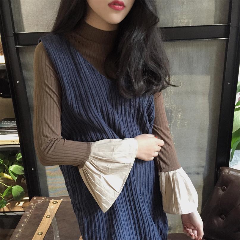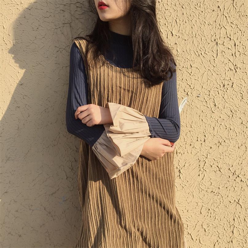 / 新款chic修身女中長款喇叭袖連衣裙燈芯絨背心裙兩件套小香風套裝
