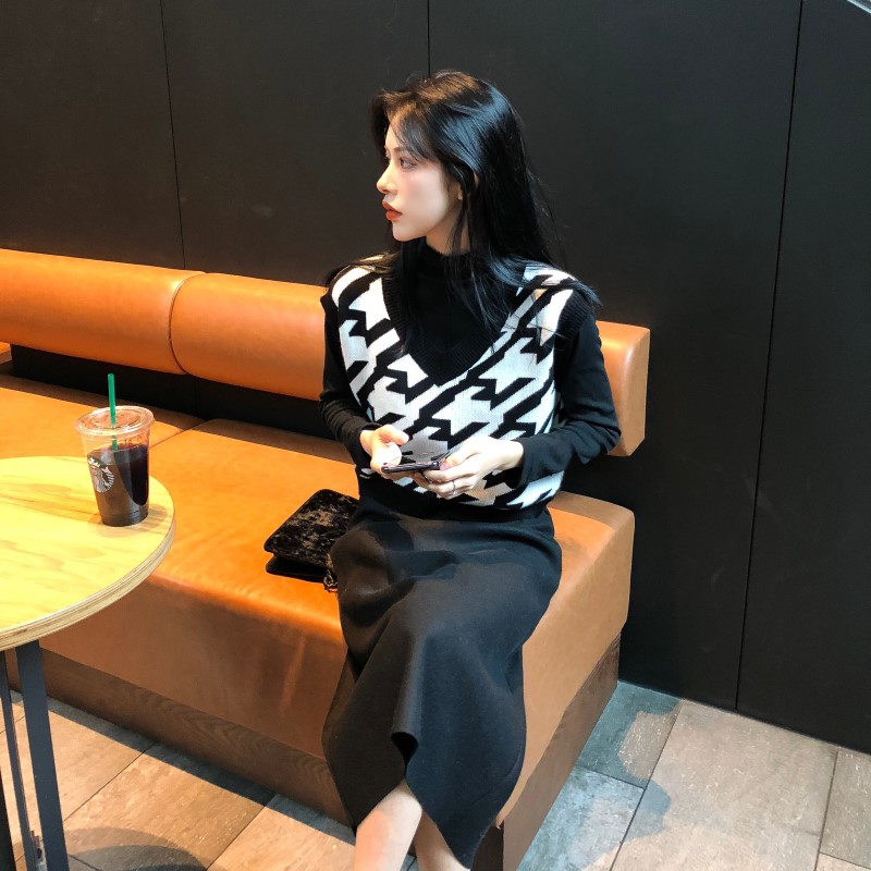/ 韓版百搭撞色邊V領背心馬甲+長袖打底衫+中長款半身裙時尚三件套