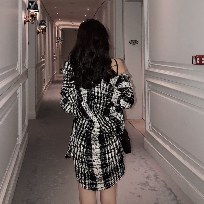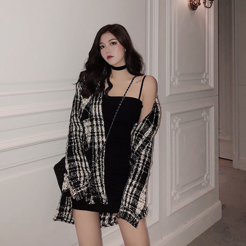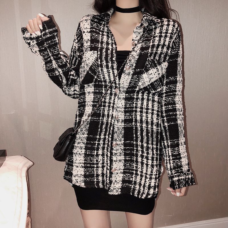 / 2018秋冬新款韓版時尚粗花呢黑白格子襯衫寬松外套開衫小香風上衣