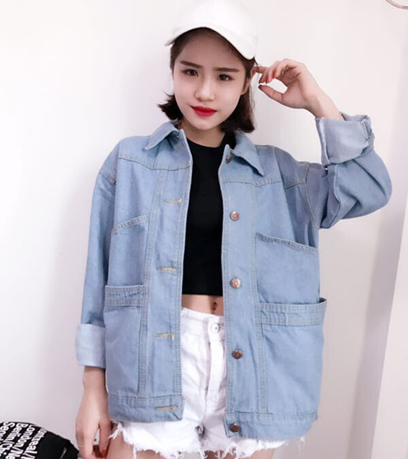 早秋新款女裝韓版寬松大口袋長袖淺藍色牛仔外套女學生休閑上衣潮