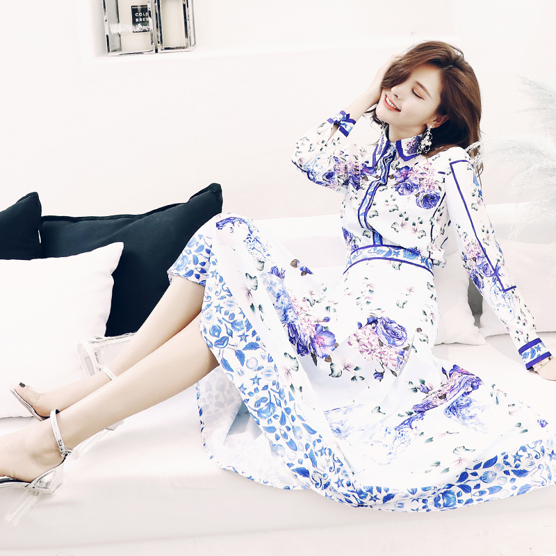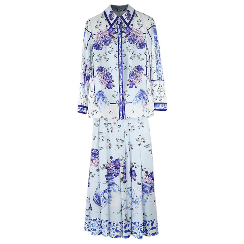 網紅港味名媛氣質復古印花顯瘦長袖印花襯衫百褶半身裙兩件套裝女