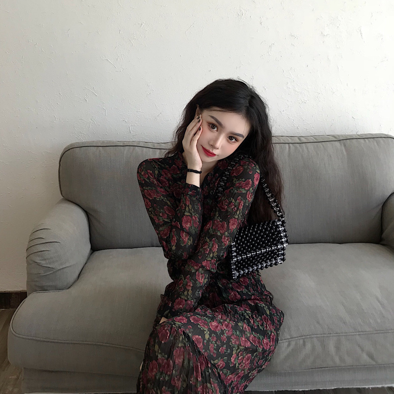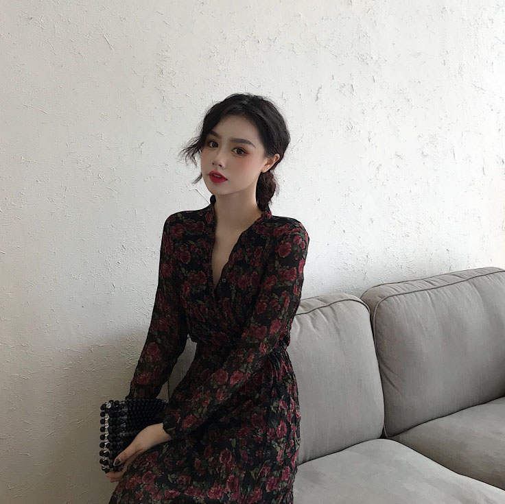 chic早秋裙子長裙女慵懶風韓版水波紋修身顯瘦長款玫瑰花連衣裙潮