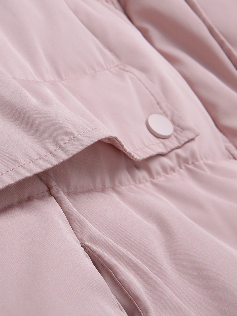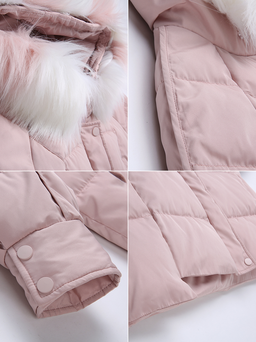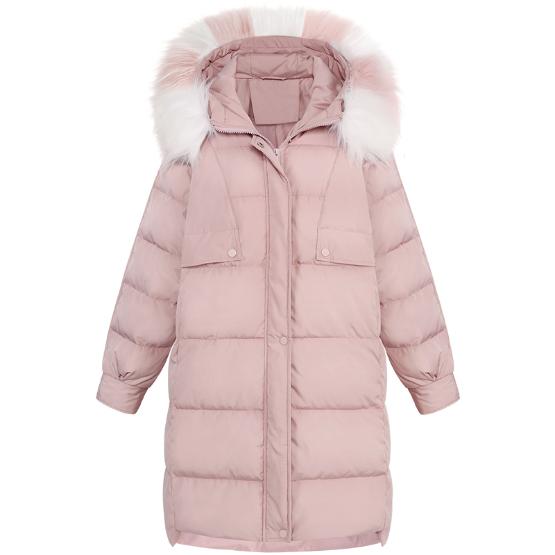 MG小象休閑粉色棉衣女冬裝新款中長款連帽面包服寬松大毛領外套潮