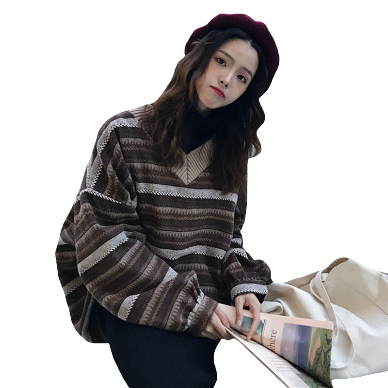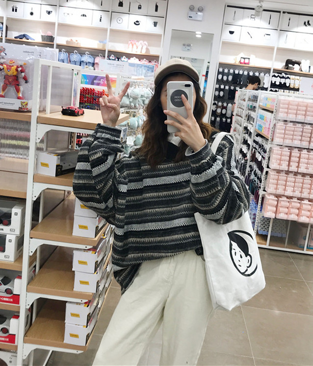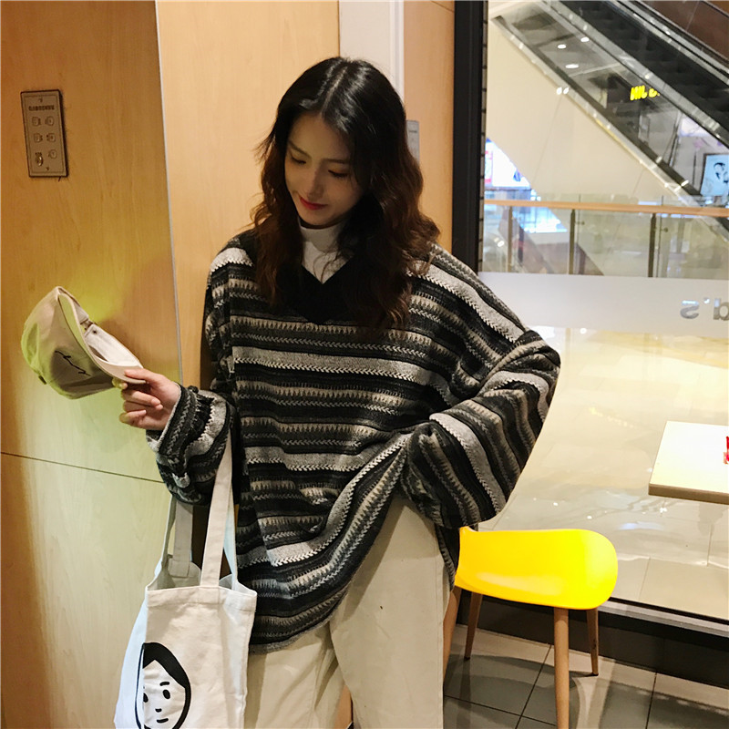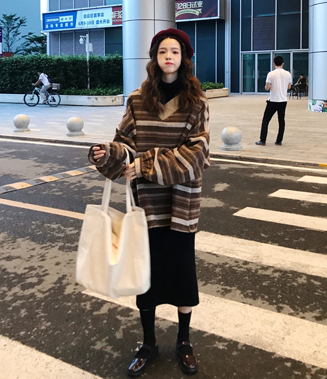 / 秋冬女裝韓版chic中長款復古寬松條紋慵懶風毛呢pp home衛衣外套