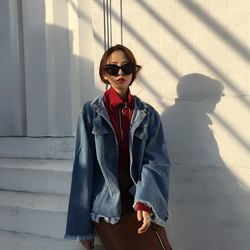 慵懶風秋裝女2018新款復古夾克牛仔外套女春秋+純色V領吊帶連衣裙