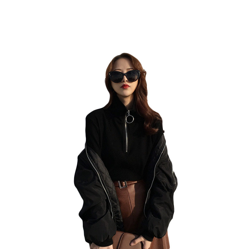 秋裝女2018新款港味復古百搭圓環拉鏈高領顯瘦螺紋長袖打底衫T恤