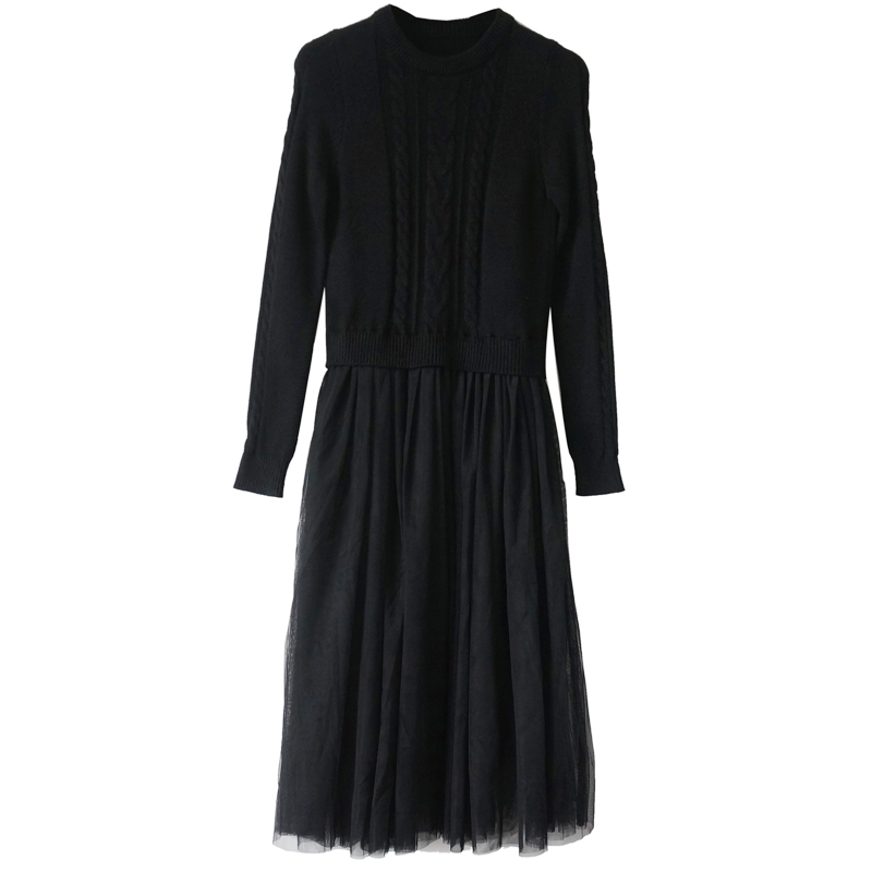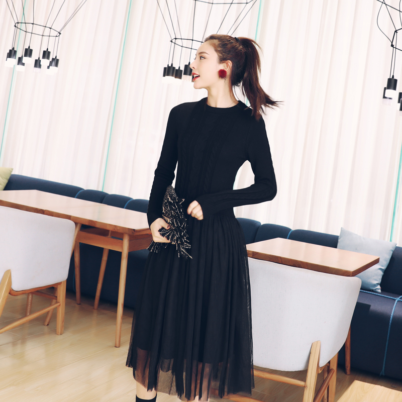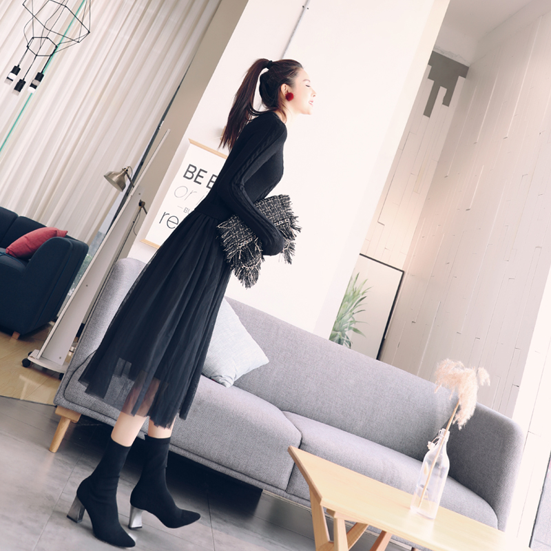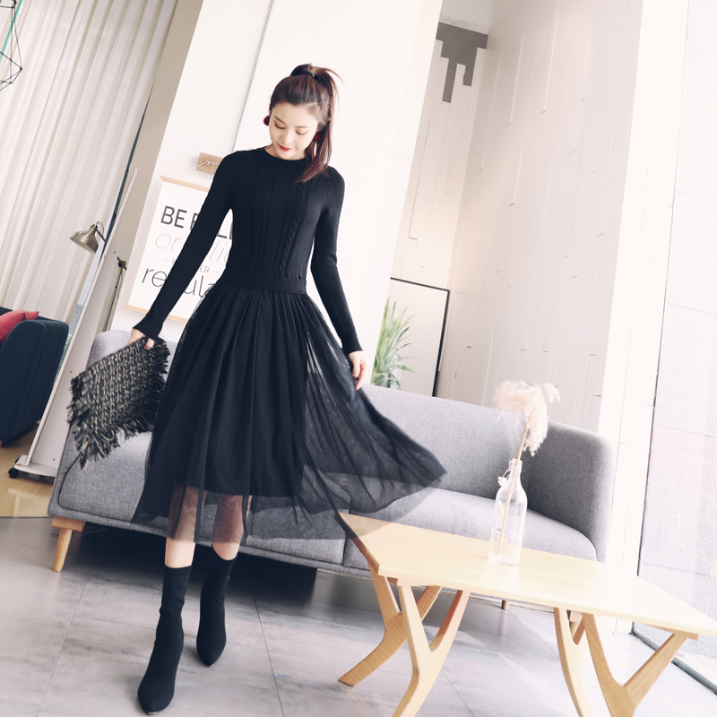 名媛打底裙子2018秋冬女裝新款針織衫拼接網紗假兩件中長款連衣裙