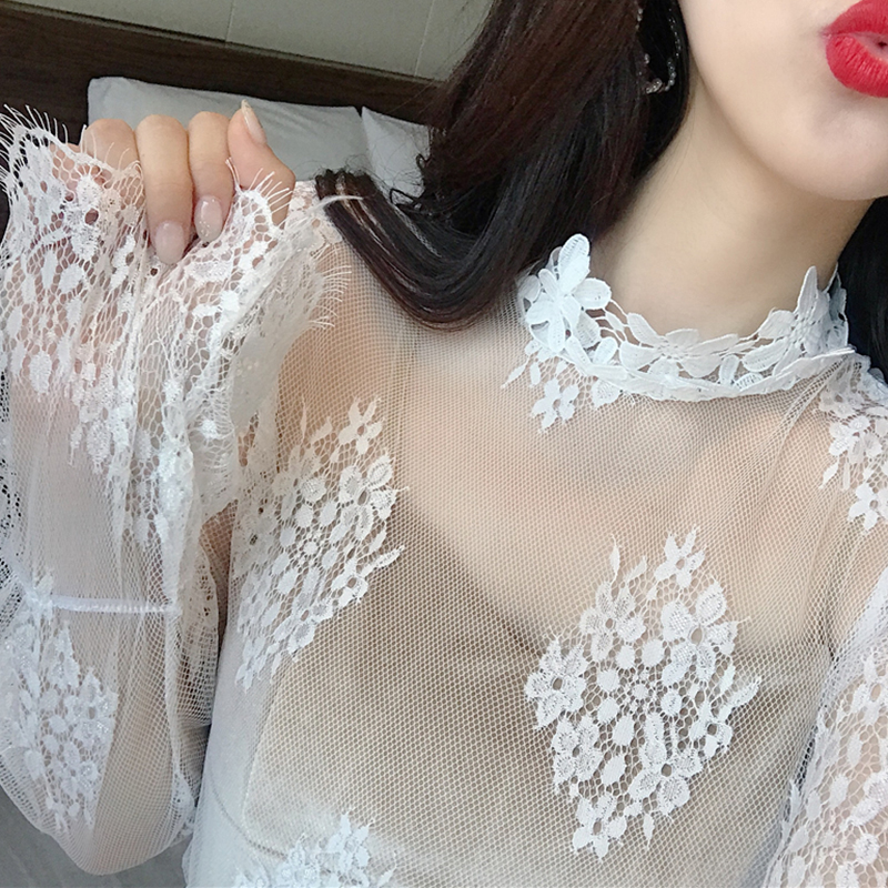 / 蕾絲透視拼接花邊氣質網紗上衣秋冬女裝新款韓版時尚喇叭長袖T恤