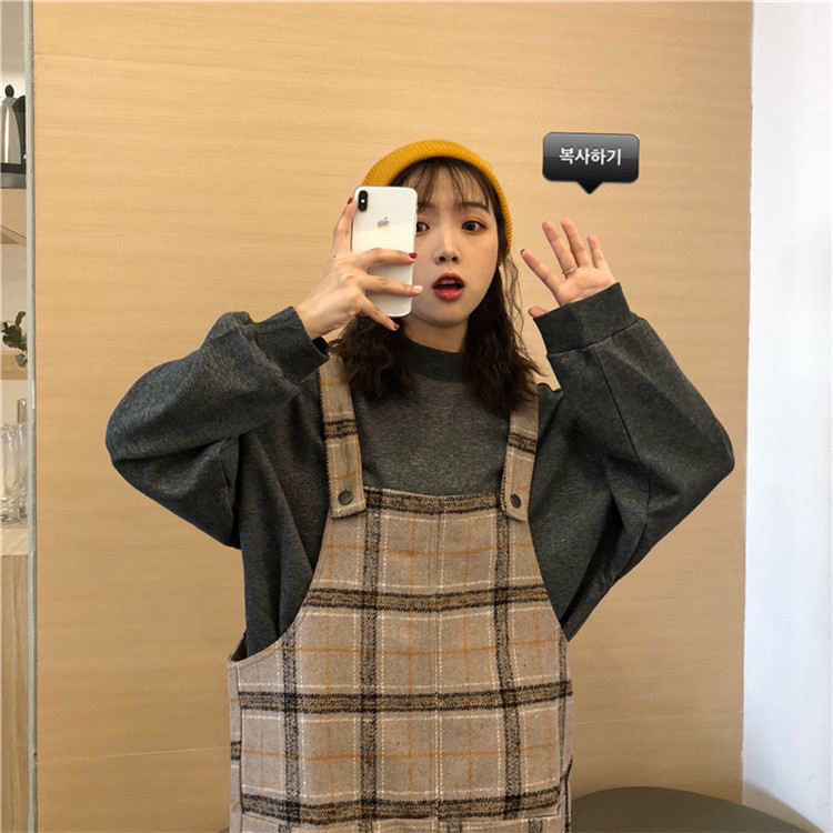 / 韓版時尚休閑套裝秋冬寬松高領衛衣+復古格子毛呢背帶裙兩件套女
