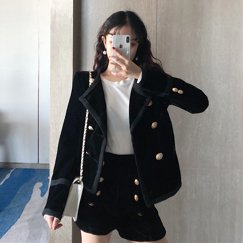 / 2018秋季港味新款名媛小香風金絲絨外套排扣金絲絨短褲時尚套裝女