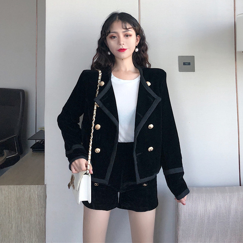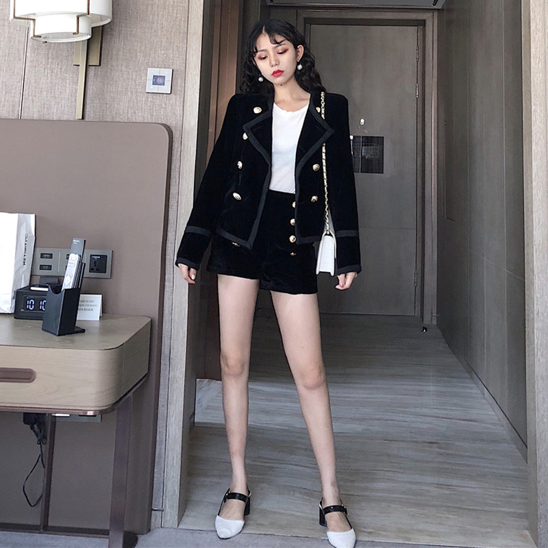 2018秋季港味新款名媛小香風金絲絨外套排扣金絲絨短褲時尚套裝女
