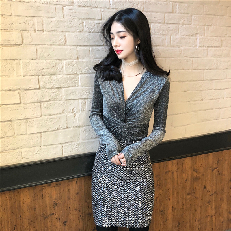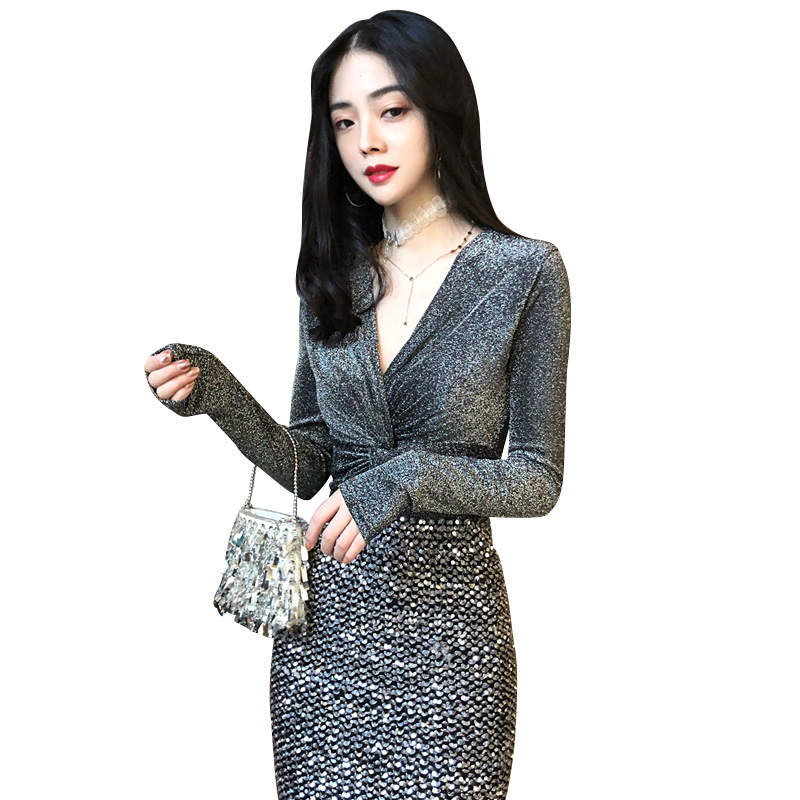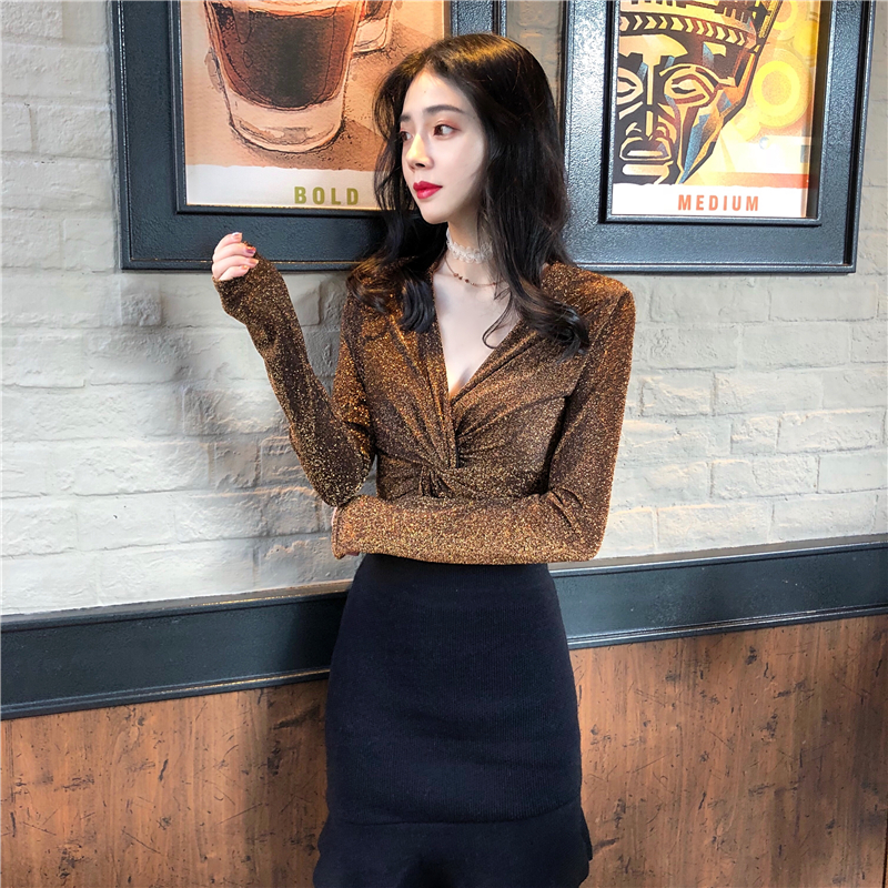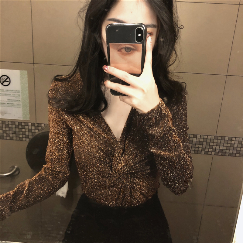 chic早秋上衣女2018新款韓版百搭時尚修身V領氣質復古港風打底衫