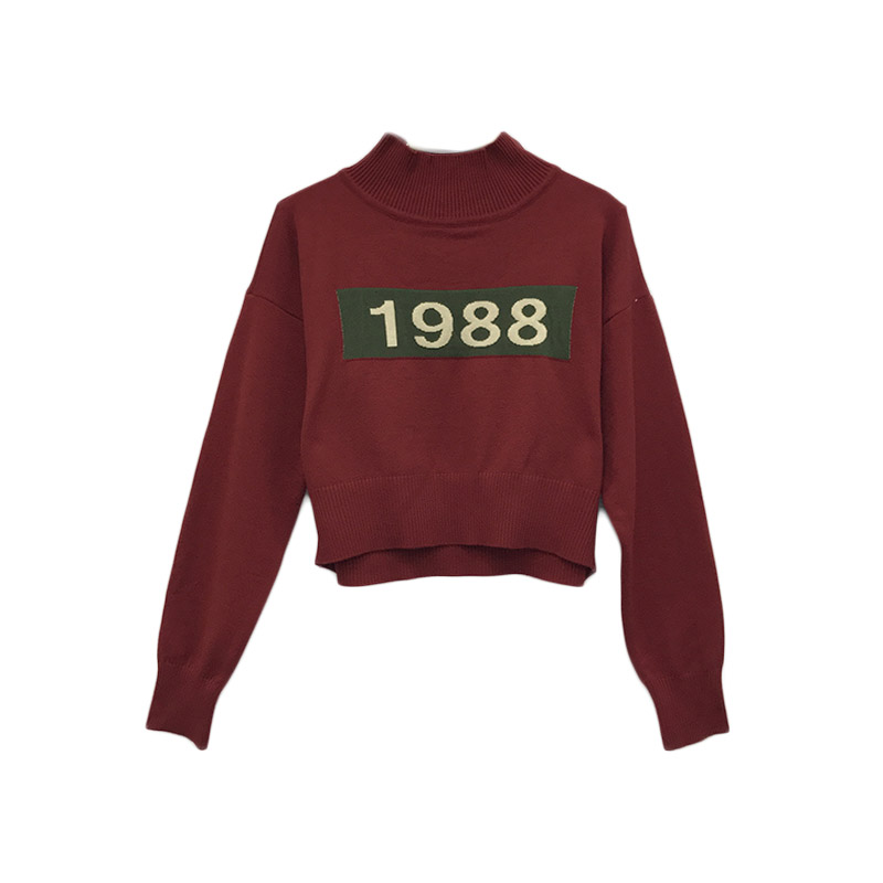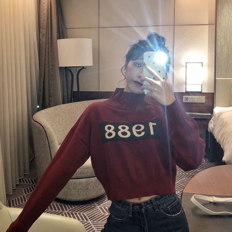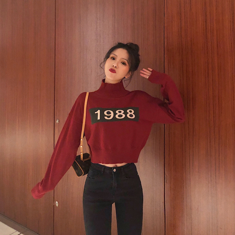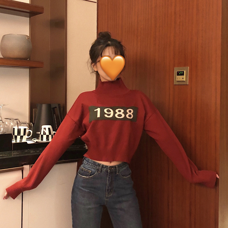 毛衣外套女韓版2018新款高領短款針織衫1988撞色圖案套頭女上衣潮