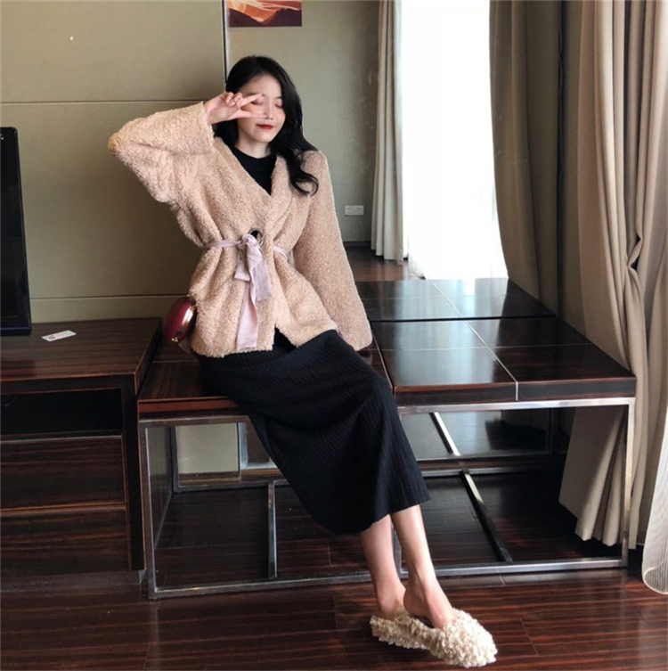 韓版加厚保暖寬松百搭羊羔毛大衣女+打底針織衫+半身裙時尚三件套