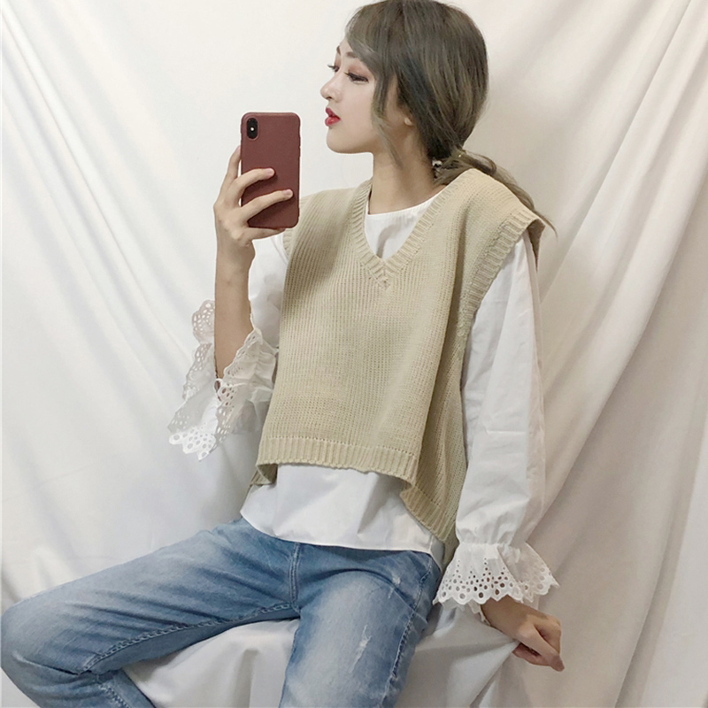 / 兩件套女裝寬松V領針織馬甲背心外搭無袖毛衣+白色長袖襯衫套裝秋