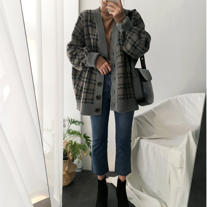 2018秋裝時尚chic復古韓國千鳥格針織開衫氣質小香風時尚百搭外套