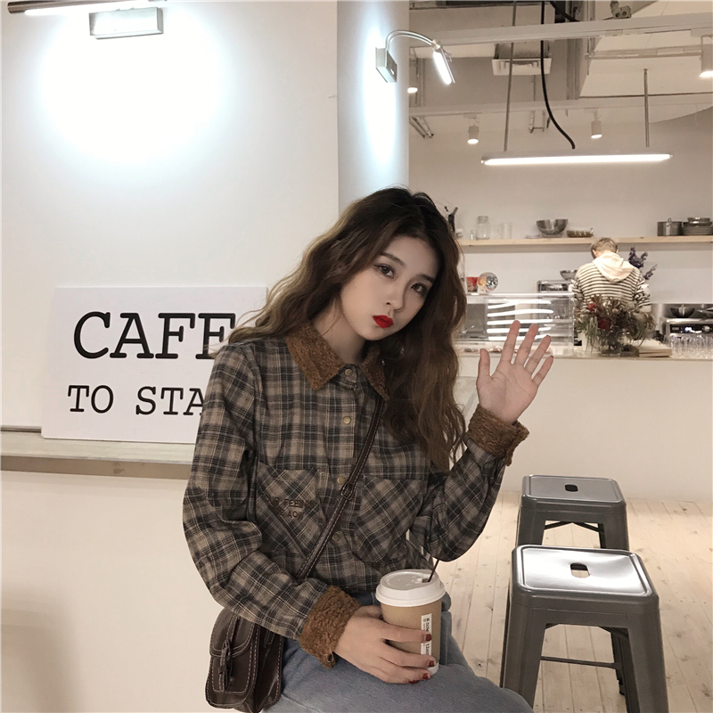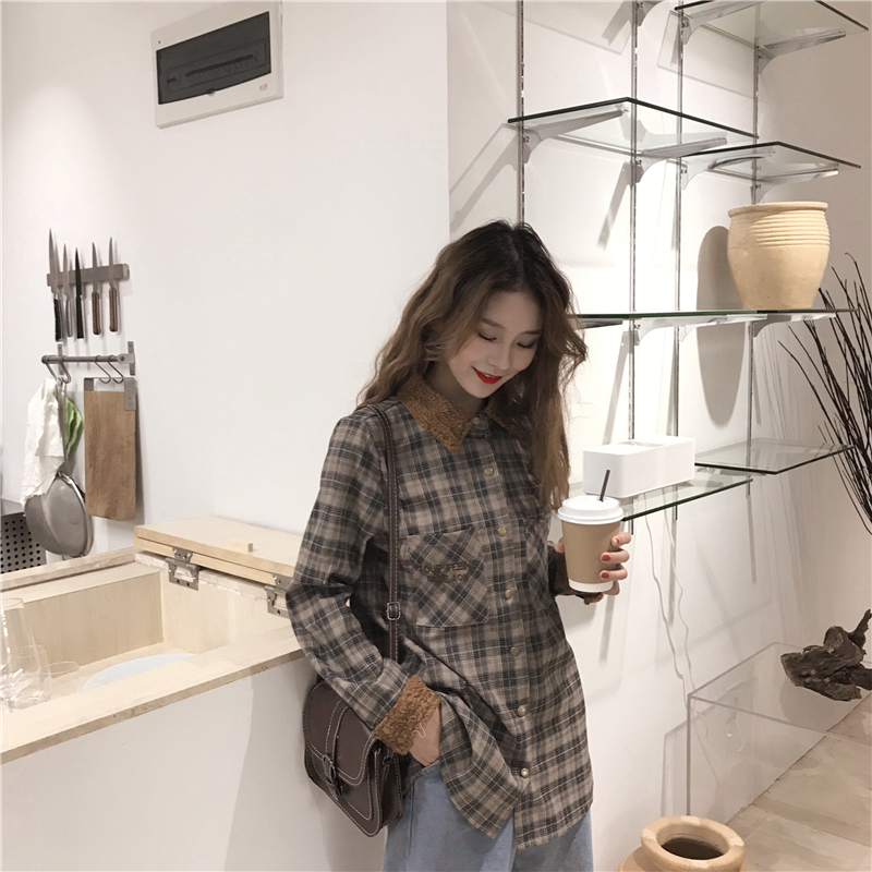 / 秋季女裝韓版復古chic毛絨拼接字母刺繡襯衣學生格子休閑襯衫上衣
