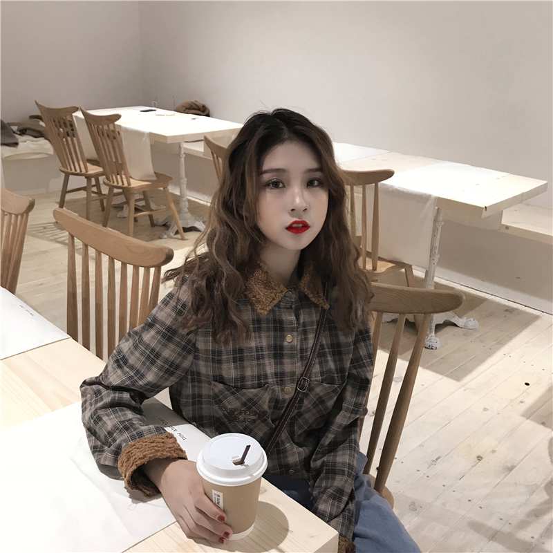 秋季女裝韓版復古chic毛絨拼接字母刺繡襯衣學生格子休閑襯衫上衣