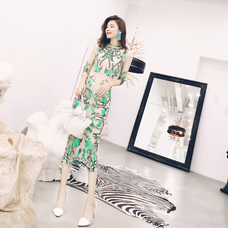 名媛氣質2018夏連衣裙女重工刺繡印花網紗裙超仙顯瘦性感氣質長裙