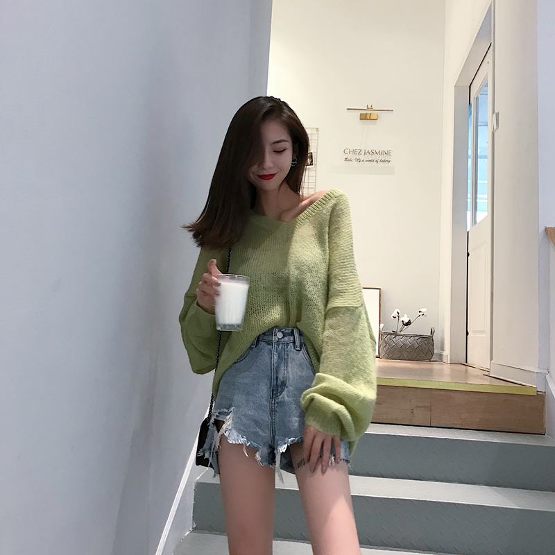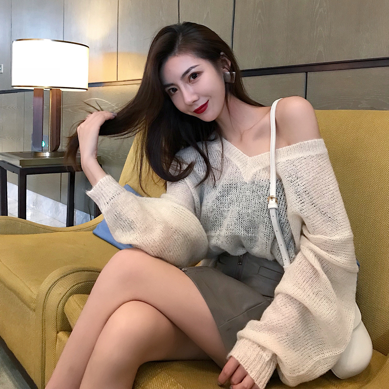 2018秋裝新款韓版百搭復古chic上衣寬松套頭慵懶風V領長袖毛衣女