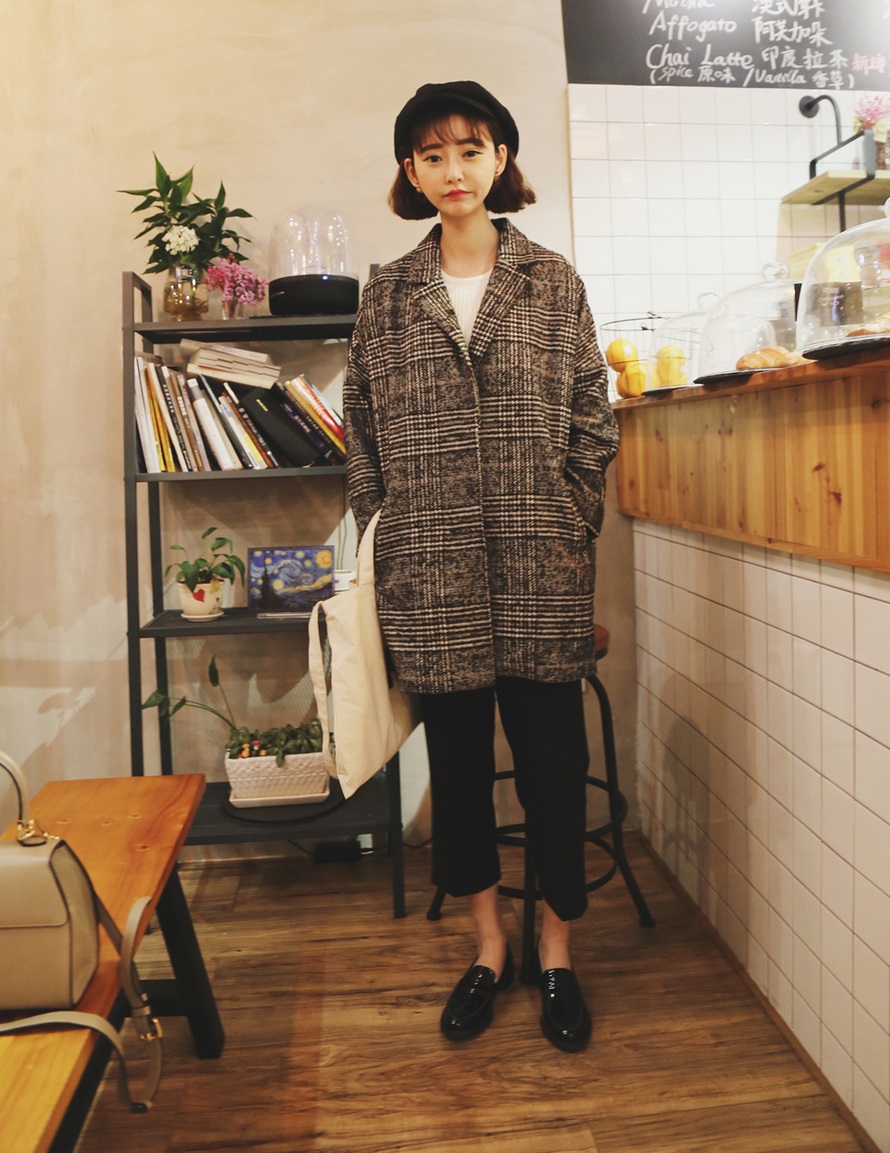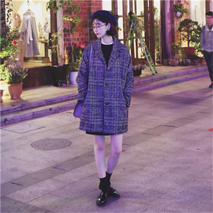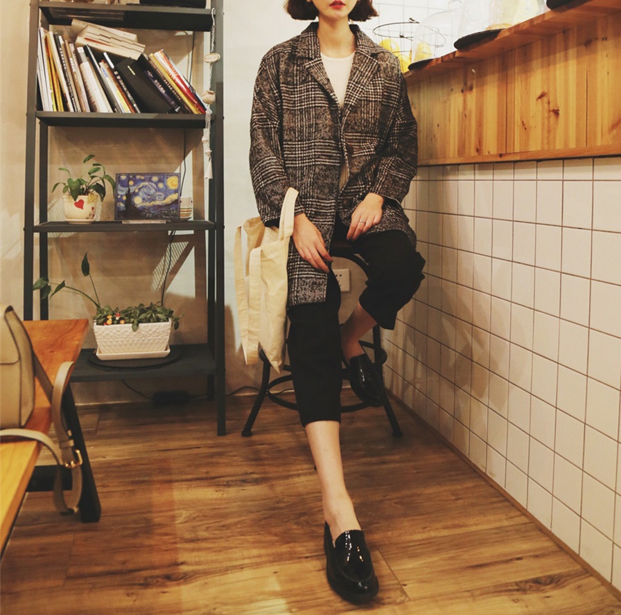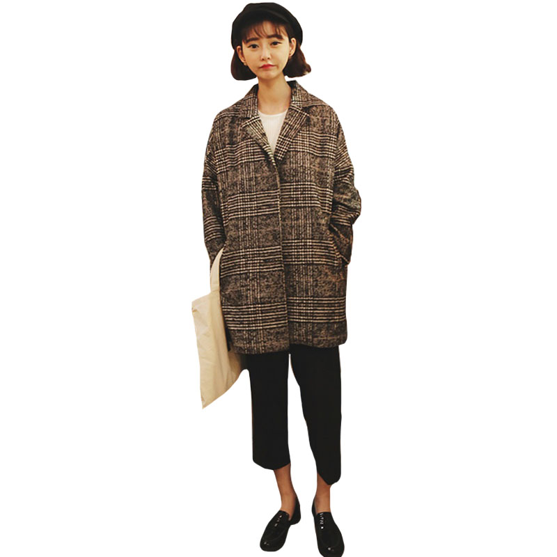 / 秋冬韓版中長款赫本風格子毛呢外套學生寬松千鳥格休閑呢子大衣女
