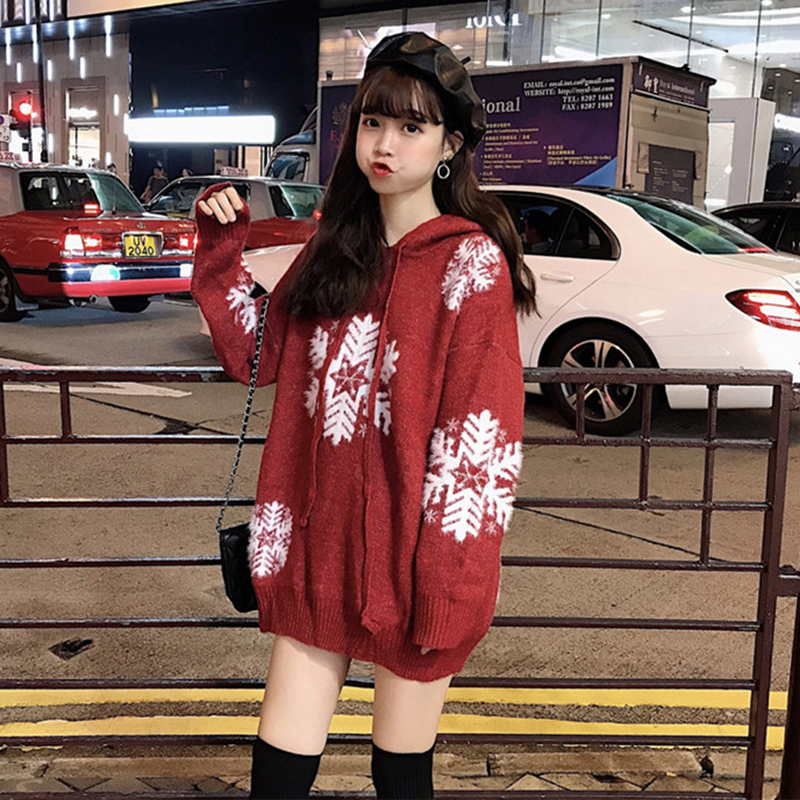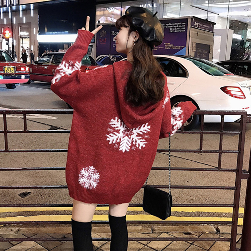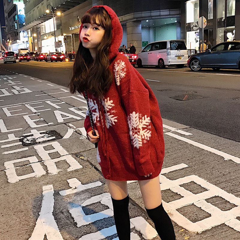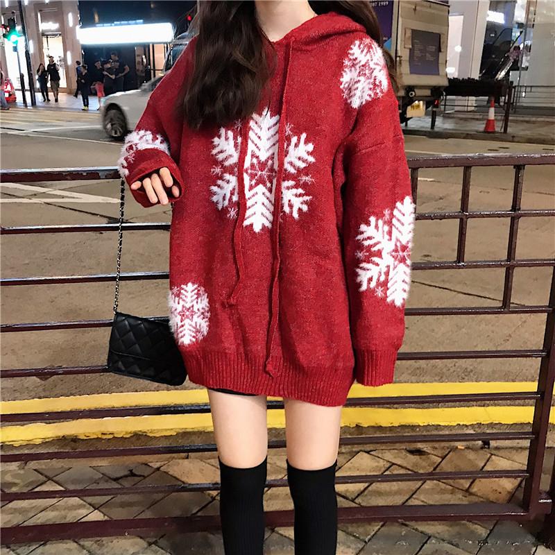 慵懶風圣誕雪花連帽針織衫女秋冬裝2018新款韓版寬松百搭毛衣外套
