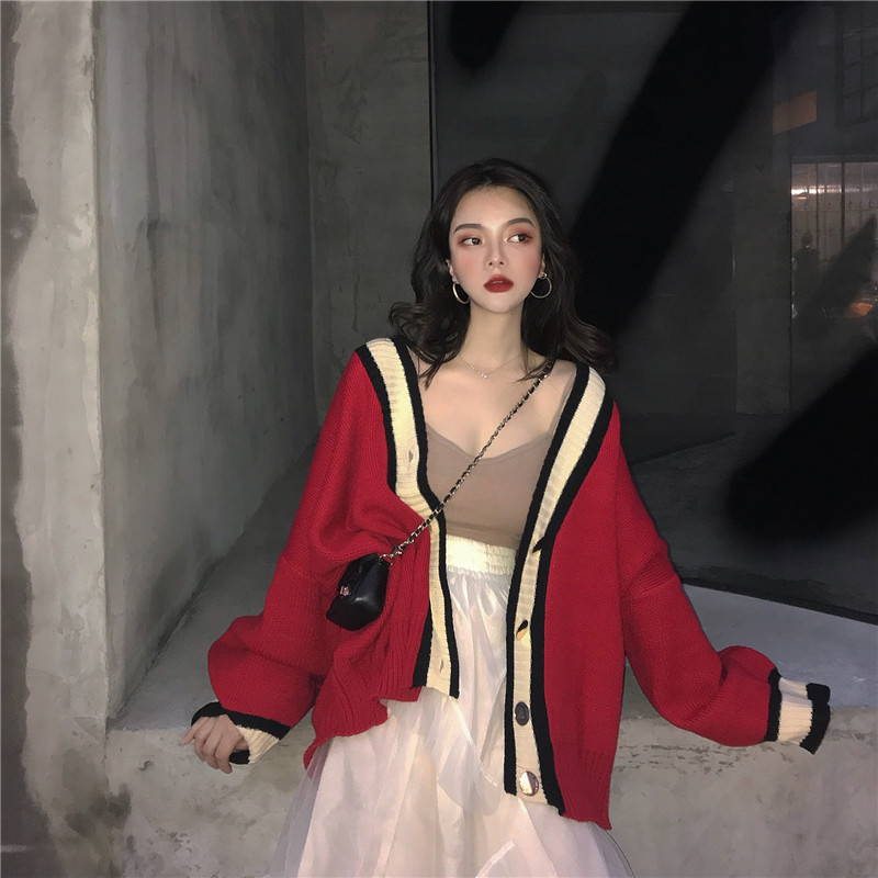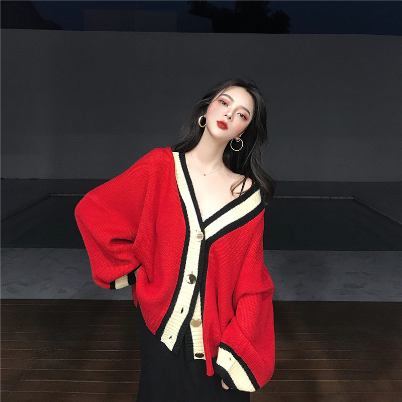 韓國慵懶風百搭新款復古chic時尚撞色V領單排扣長袖針織外套開衫
