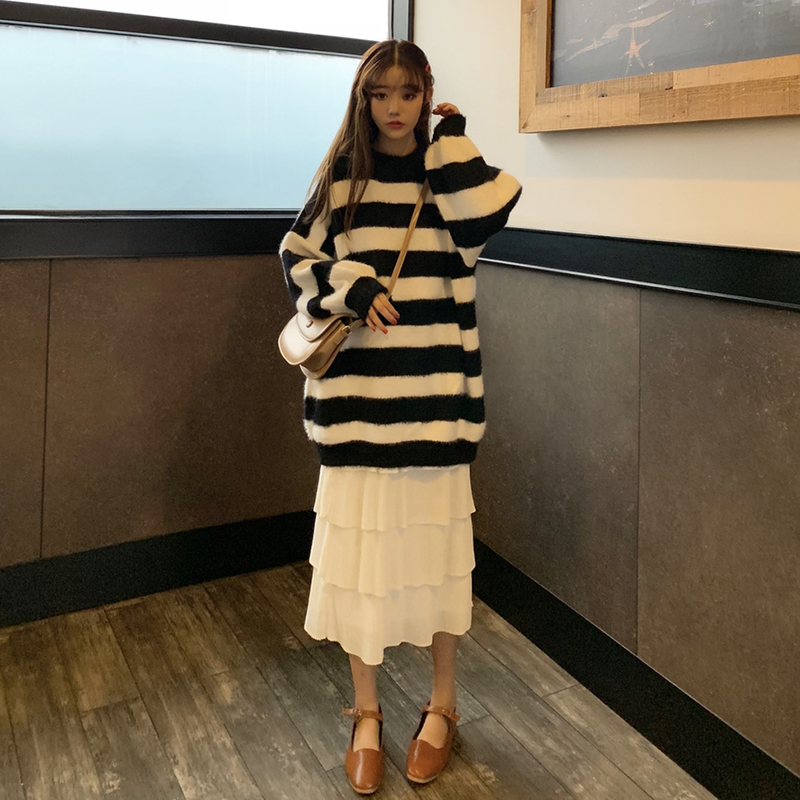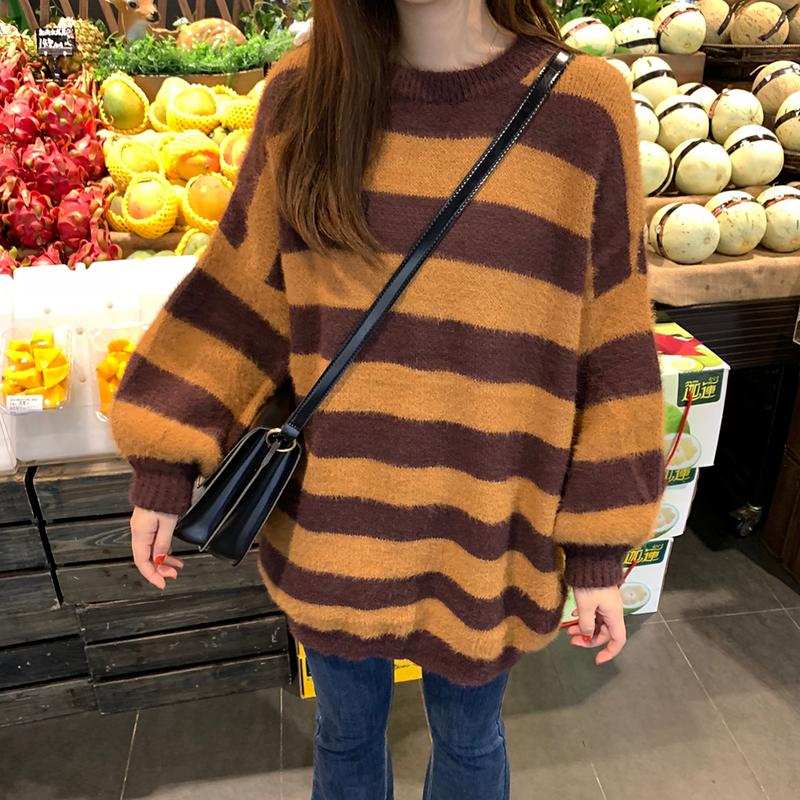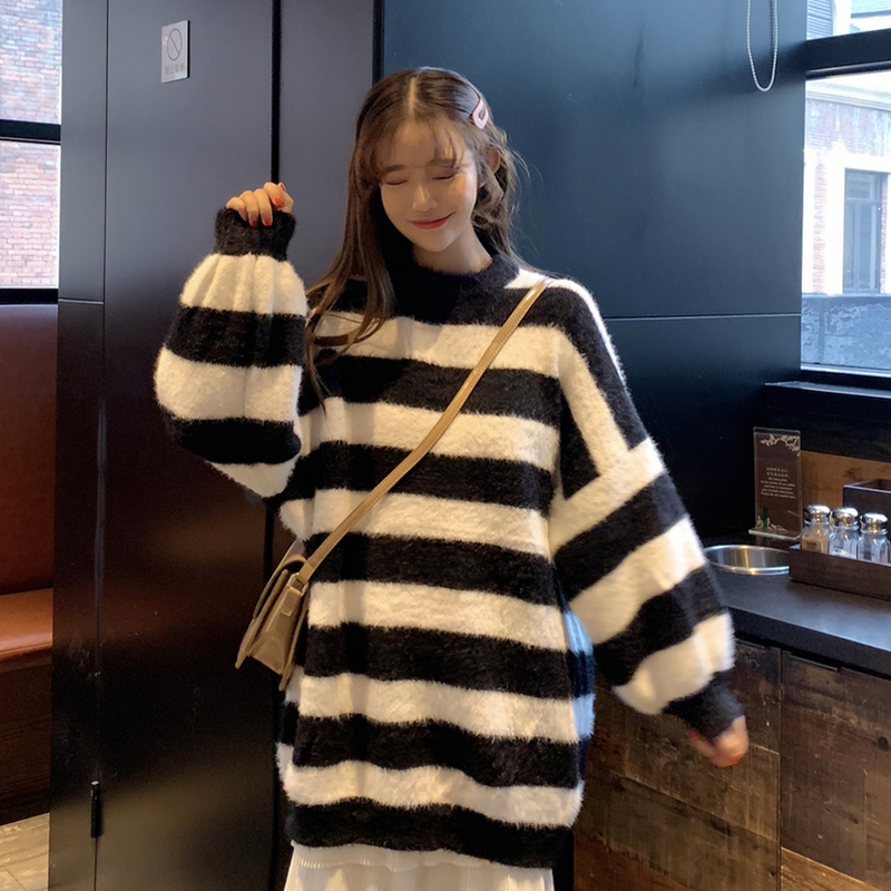 秋冬女裝2018新款韓版時尚百搭套頭針織衫學生寬松條紋毛衣外套潮