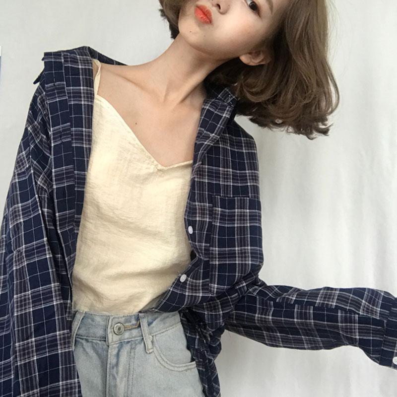 / 復古格紋襯衫女春秋新款韓版學生百搭寬松顯瘦休閑長袖開衫外套潮