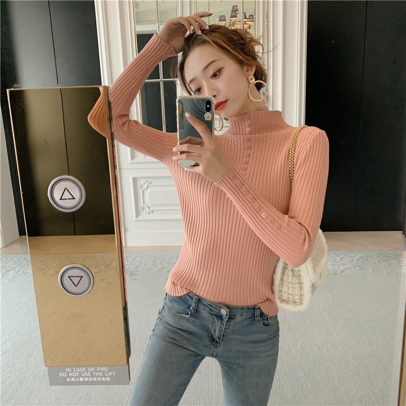 / chic氣質半高領袖口紐扣針織衫女冬裝2018新款修身顯瘦打底薄毛衣