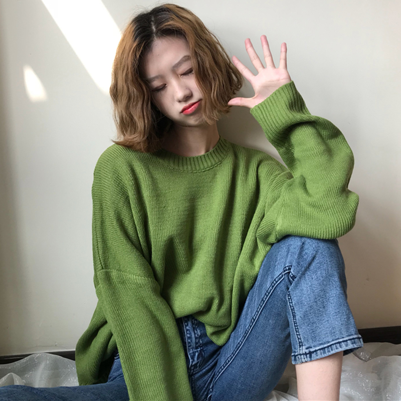 女秋裝2018新款簡約純色圓領打底毛衣學生慵懶寬松長袖開叉上衣潮