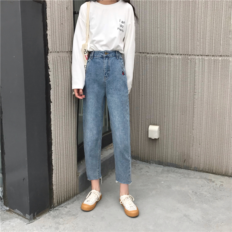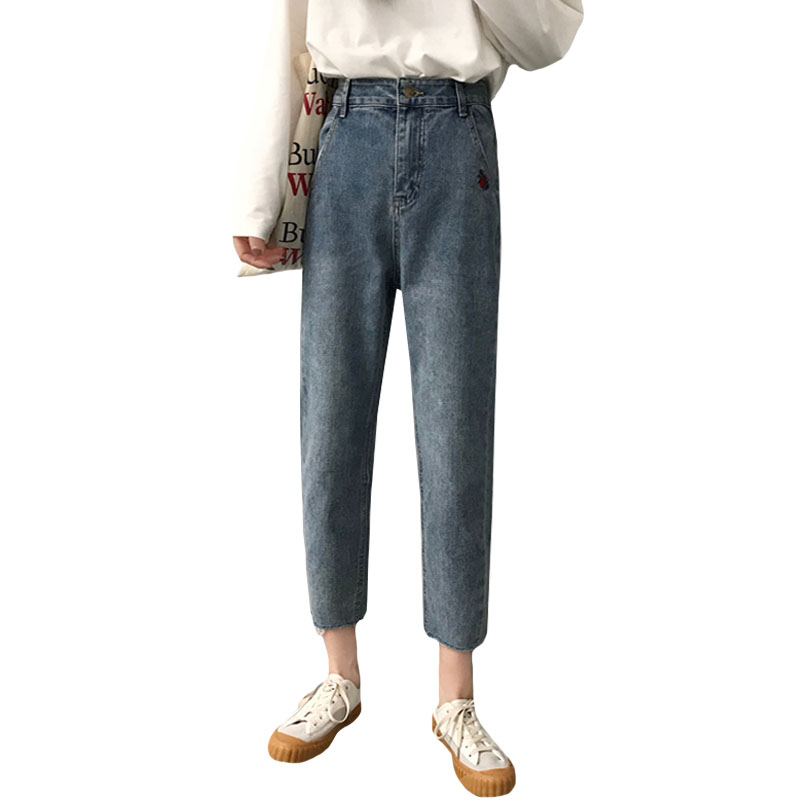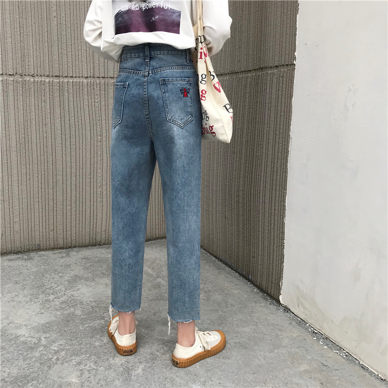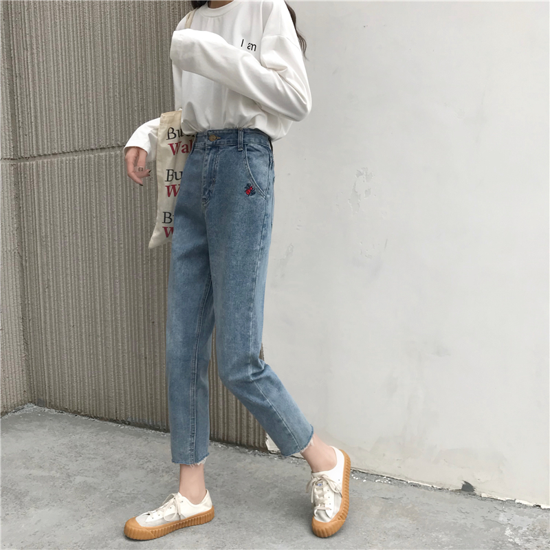 / 秋季女裝韓版高腰卡通刺繡牛仔褲寬松直筒褲闊腿褲九分褲學生褲子