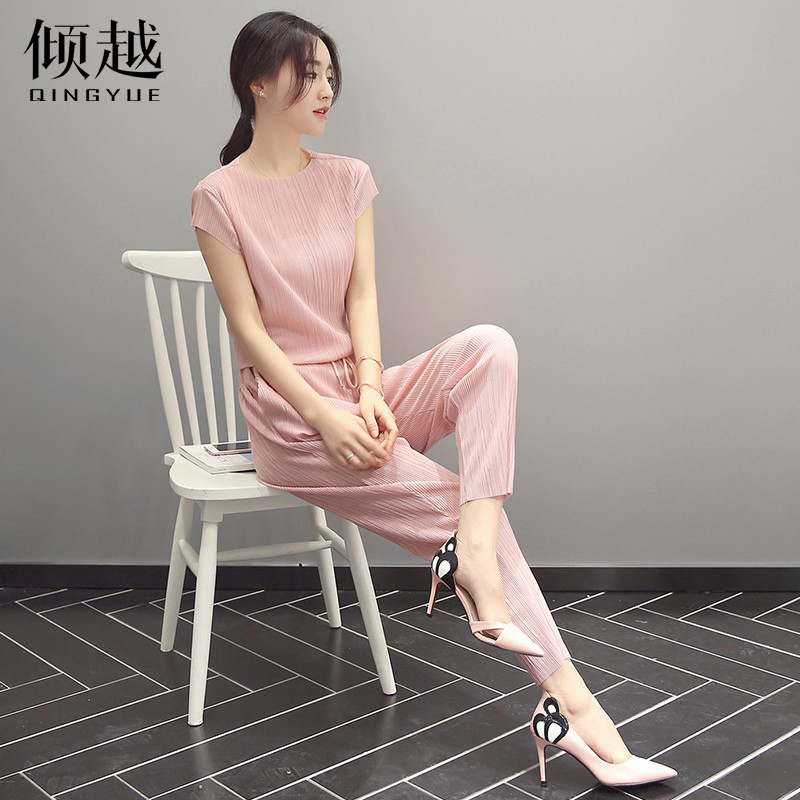 / 傾越2017夏季短袖雪紡衫九分褲休閑套裝寬松顯瘦兩件套夏大碼女裝