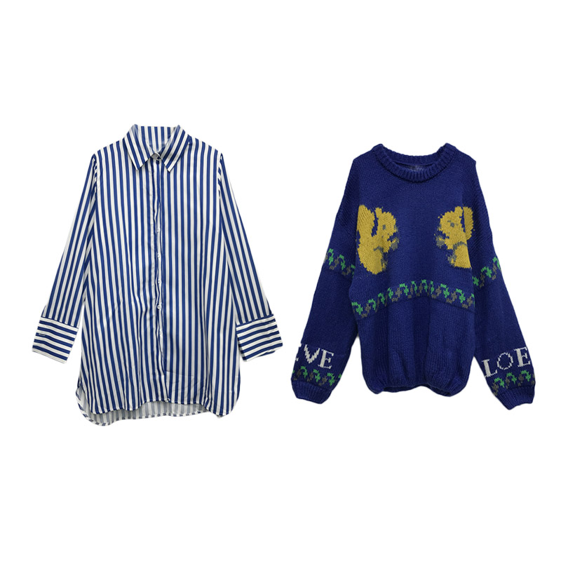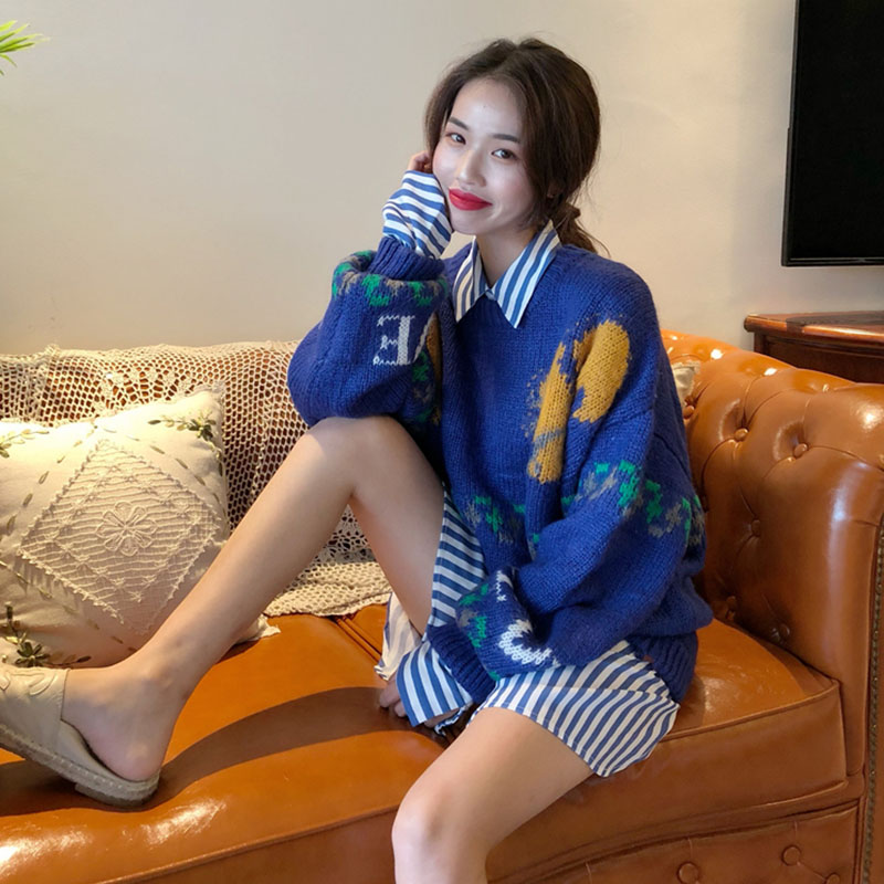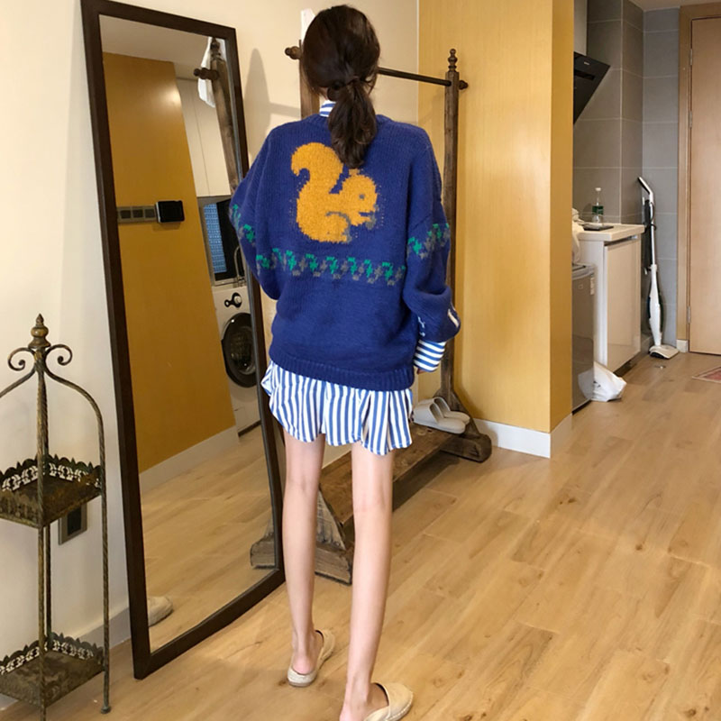 / 秋裝女2018新款套裝百搭氣質條紋襯衣+寬松套頭毛衣時尚兩件套潮