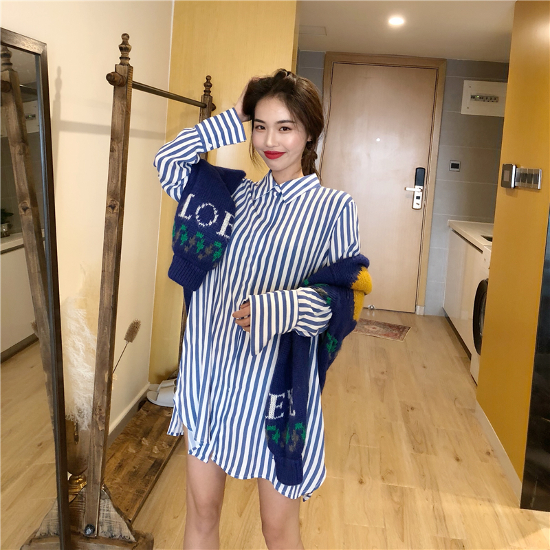 秋裝女2018新款套裝百搭氣質條紋襯衣+寬松套頭毛衣時尚兩件套潮
