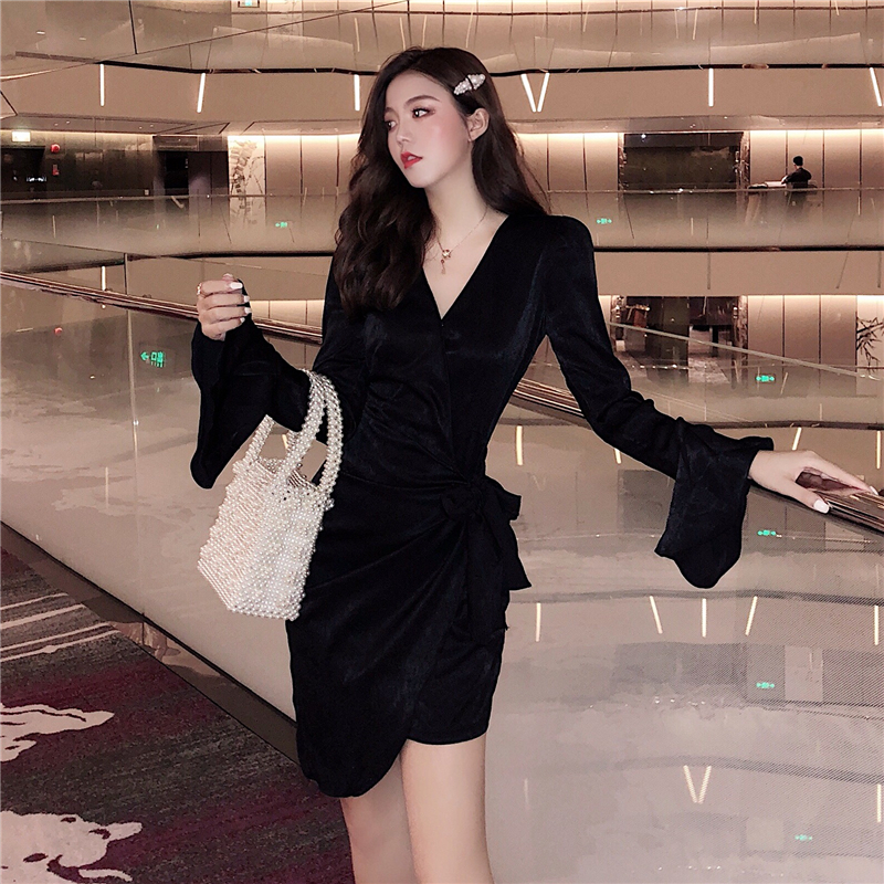 / 設計感韓版時尚不規則邊百搭新款秋冬chic綁帶收腰顯瘦光澤連衣裙
