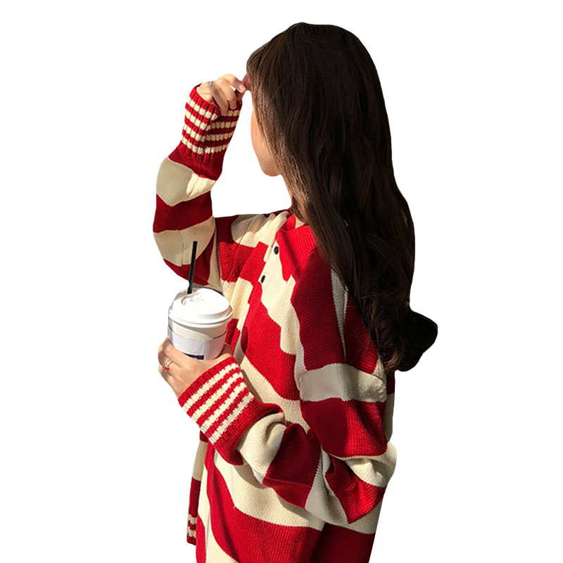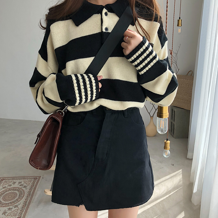 / 秋冬韓版慵懶風寬松Polo領長袖套頭條紋保暖針織衫毛衣上衣外套女