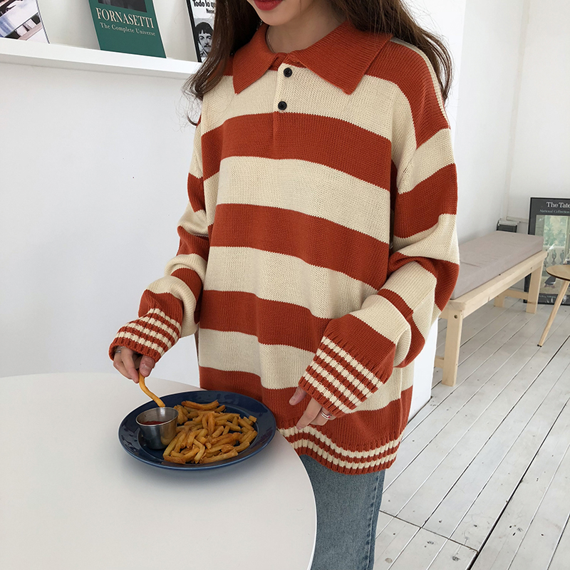 秋冬韓版慵懶風寬松Polo領長袖套頭條紋保暖針織衫毛衣上衣外套女