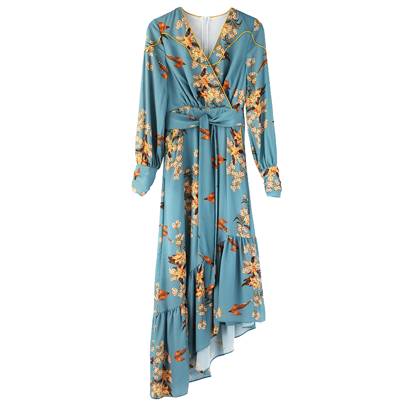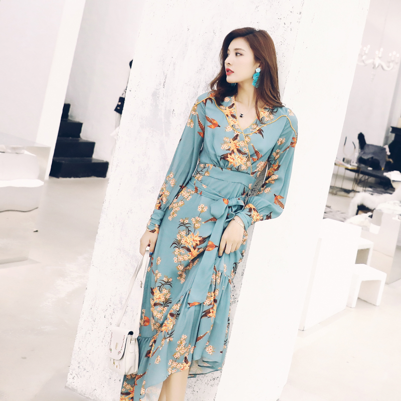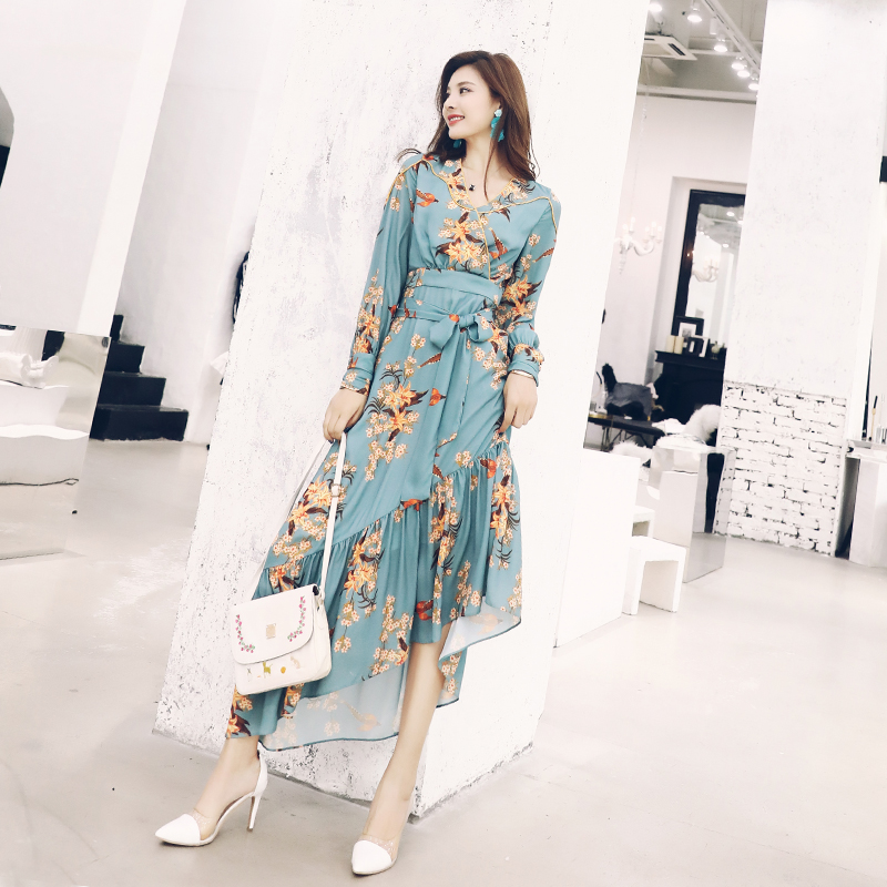 名媛女裝2018新款荷葉邊不規則收腰裙子高腰印花顯瘦中長款連衣裙