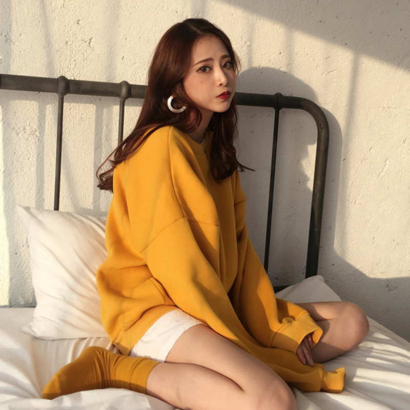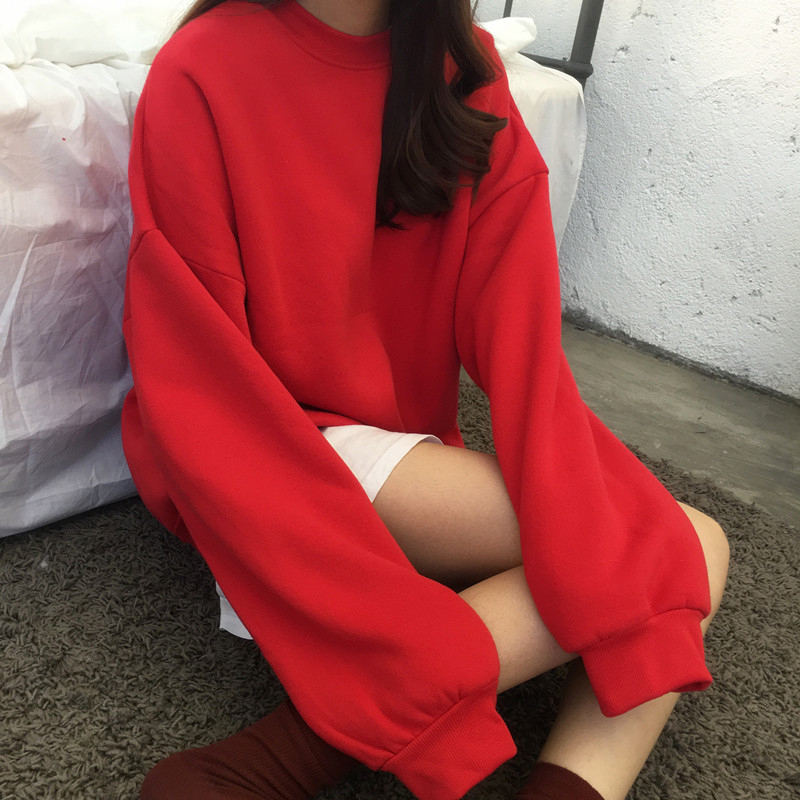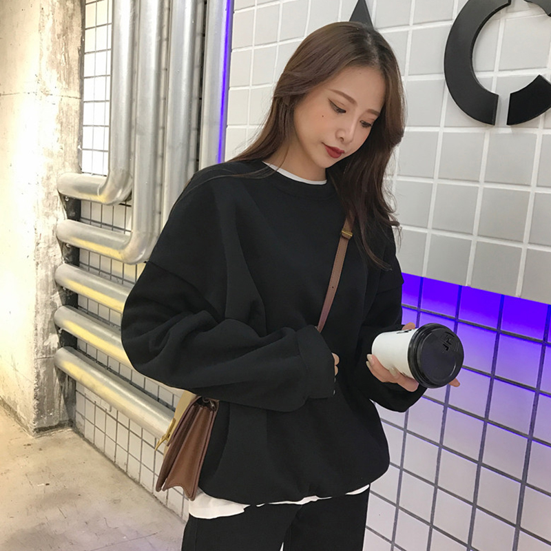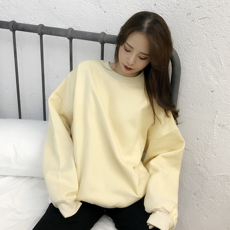 / 時尚糖果色加絨衛衣秋冬女裝新款復古風圓領休閑外套寬松長袖上衣