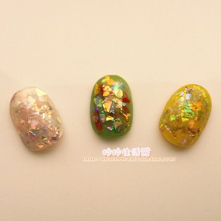 實物很閃,不規則的閃閃亮的,有很薄的彩片,也有相對厚一些的樹脂片,無論是做光療封在指甲里,還是做點綴,都是很不錯的選擇!