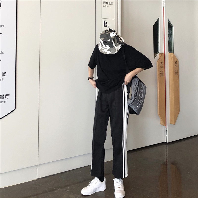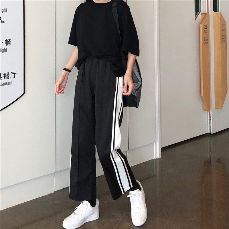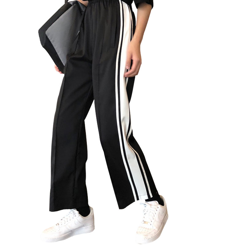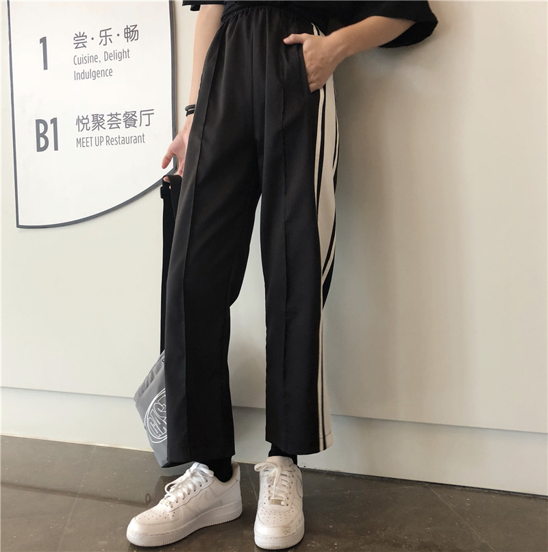 秋季女裝韓版學院風松緊腰寬松撞色休閑褲高腰運動褲闊腿褲九分褲
