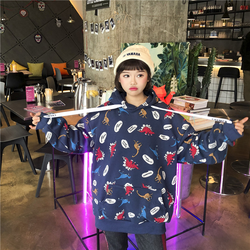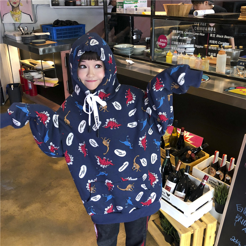 秋季女裝韓版原宿風小恐龍慵懶風寬松連帽pp home超火酷衛衣外套