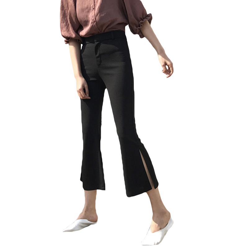腳口拼接九分褲修身百搭黑色喇叭顯瘦彈力褲女學生chic早秋休閑褲