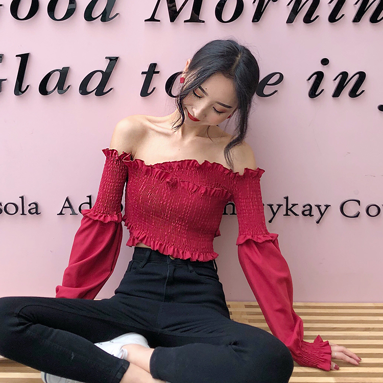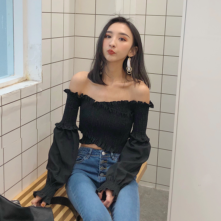 / 韓國新款落肩花邊交叉一字肩時尚純色百搭小心機拼袖短款chic上衣