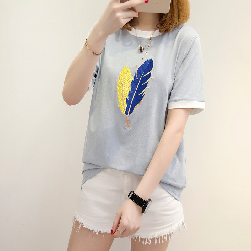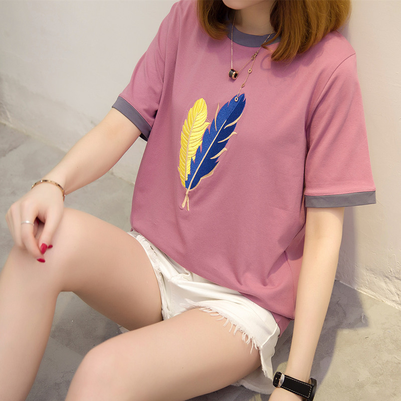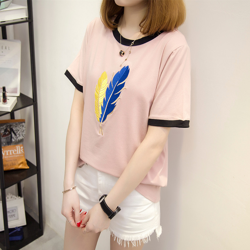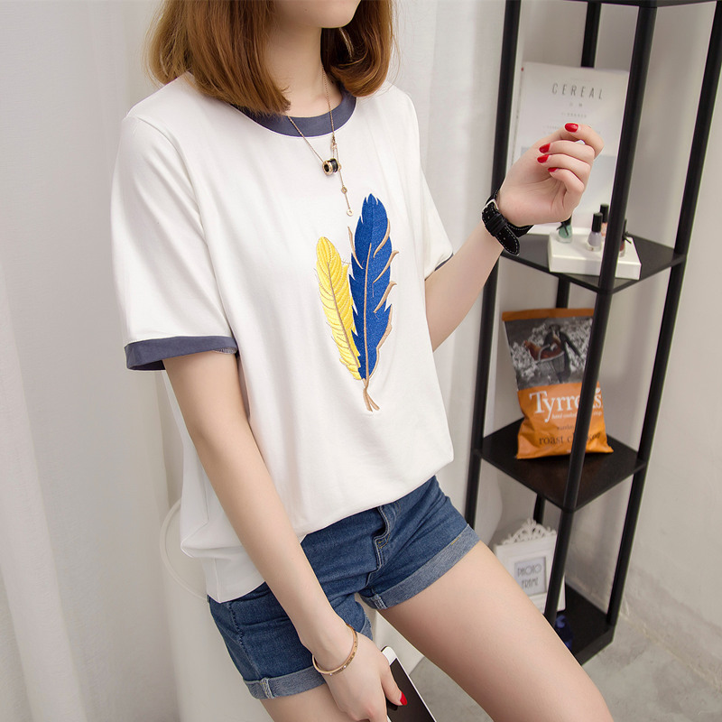 短袖t恤女夏夏季新款韓版寬松短袖女刺繡短款體恤衫上衣女潮