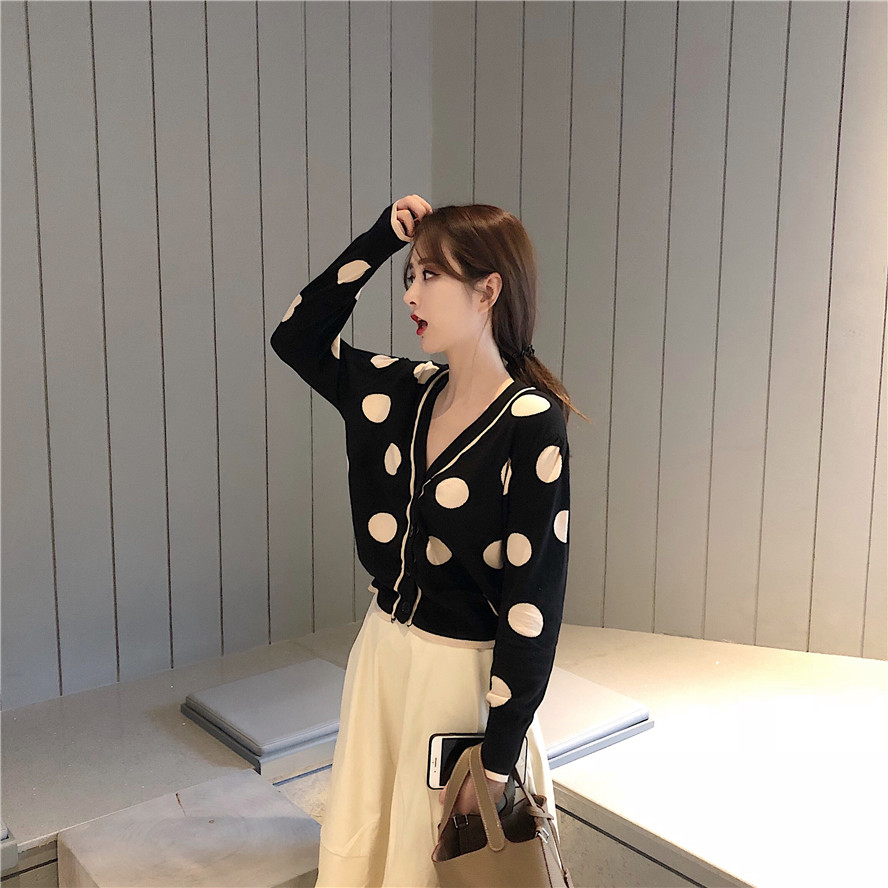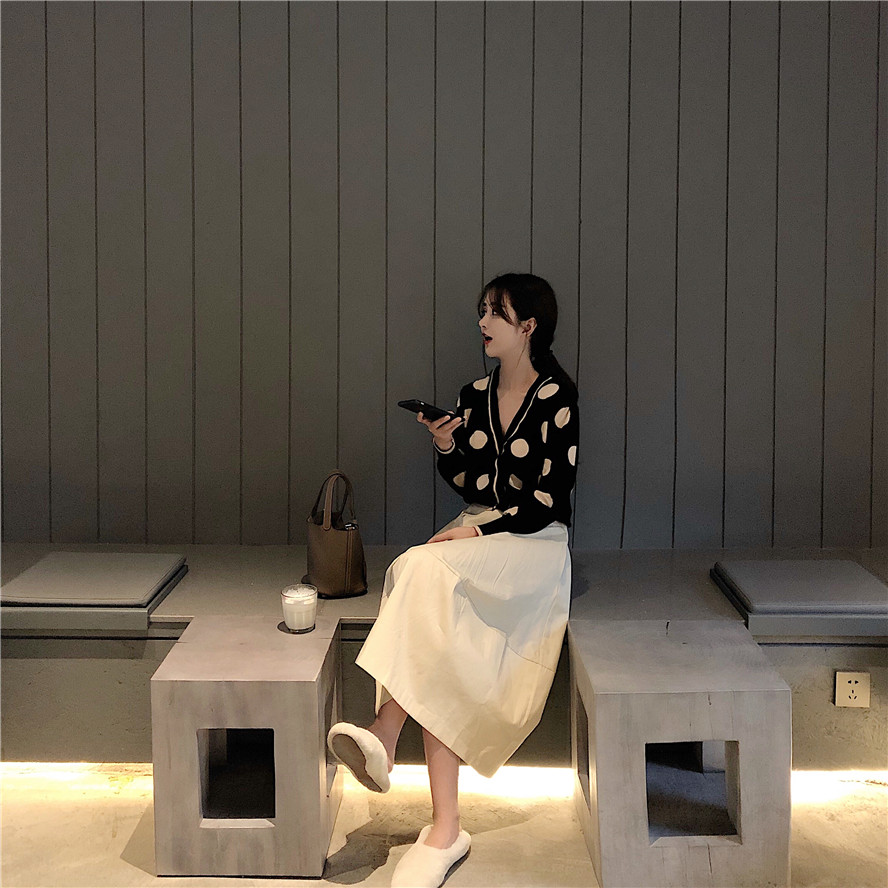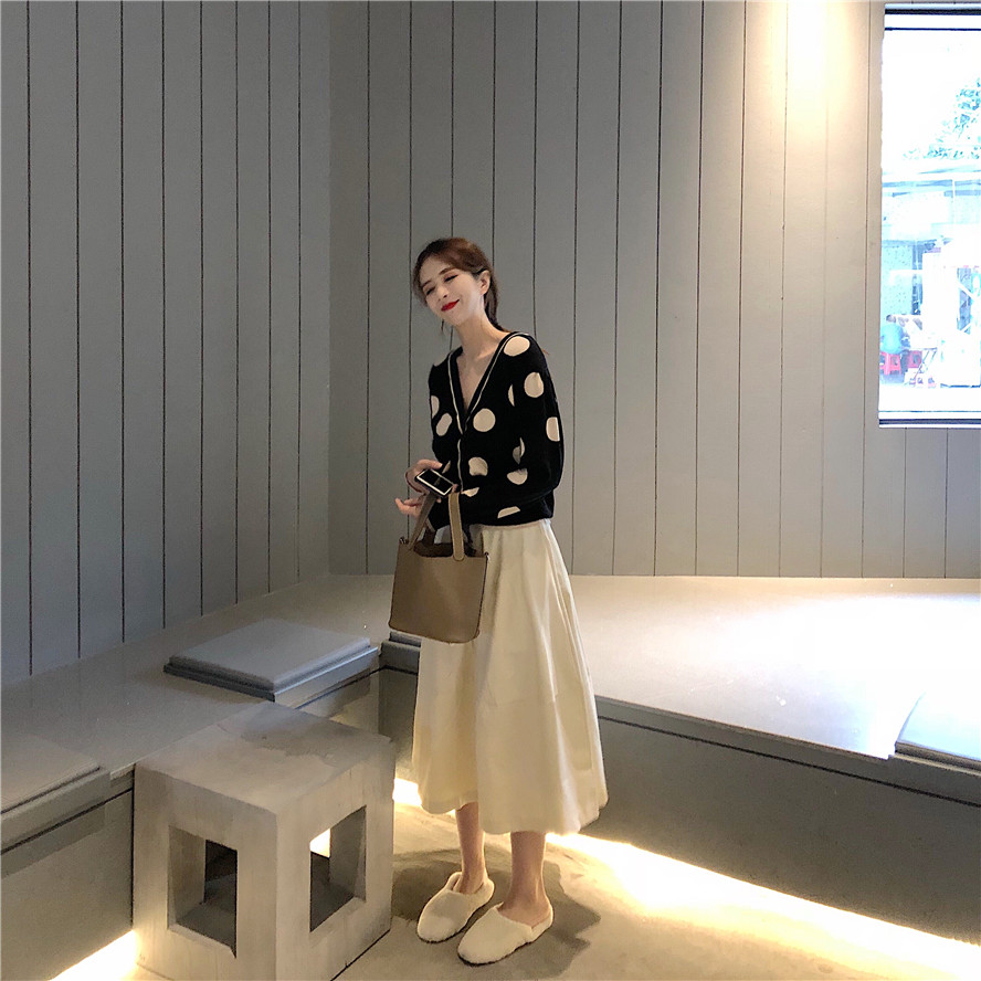2018秋季新款韓版大波點v領針織衫高腰半身裙蓬蓬a字裙時尚套裝女