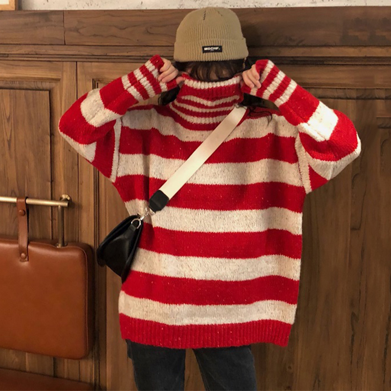 / 韓版寬松條紋長袖毛衣女秋冬裝2018新款高領針織外套學生慵懶上衣
