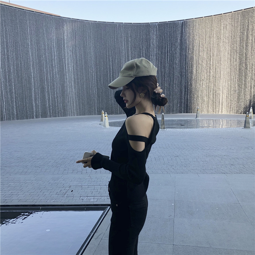 / 秋冬新款網紅同款性感氣質修身顯瘦小心機鏤空露肩長袖針織衫女潮