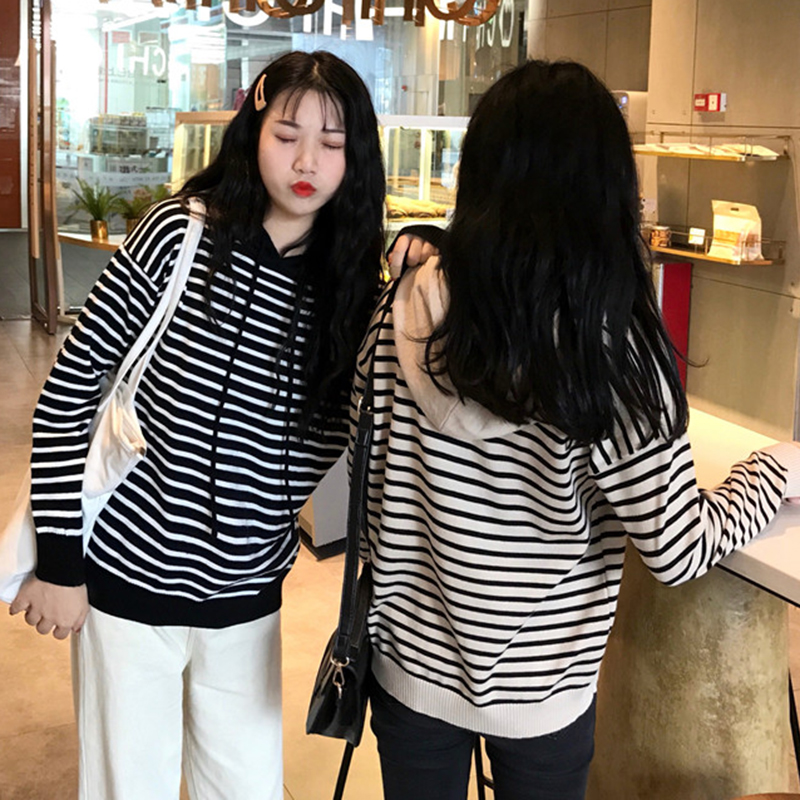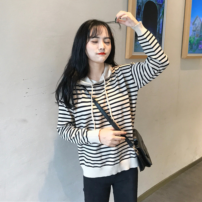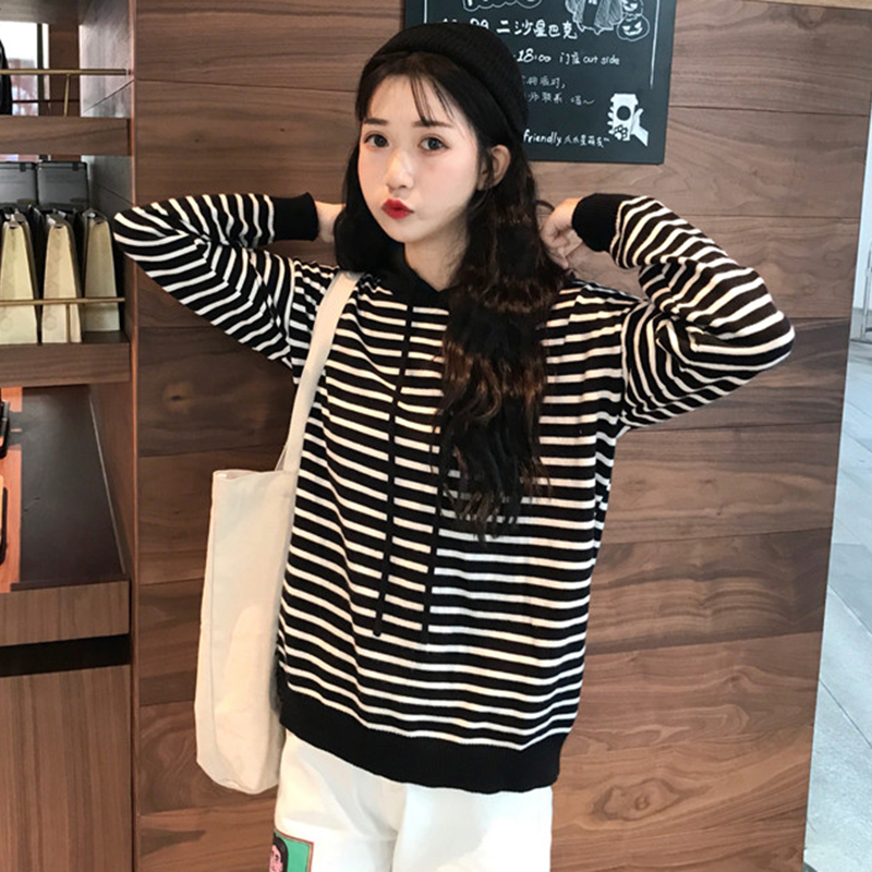 學生韓版連帽套頭針織衫女秋冬裝2018新款慵懶風撞色條紋毛衣外套